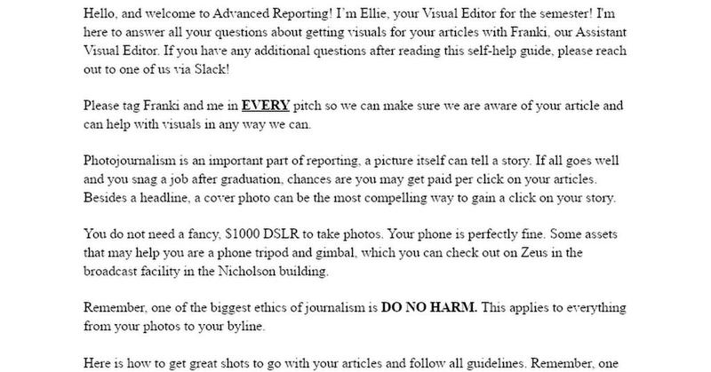 As head visual editor of NSM Today at UCF, I made sure to draft a visual 'how to' guide with the assistant visual editor and held a workshop to teach student reporters how to incorporate visuals into an article. I held myself to a high standard in this position and made sure to coach students and answer all questions they had.